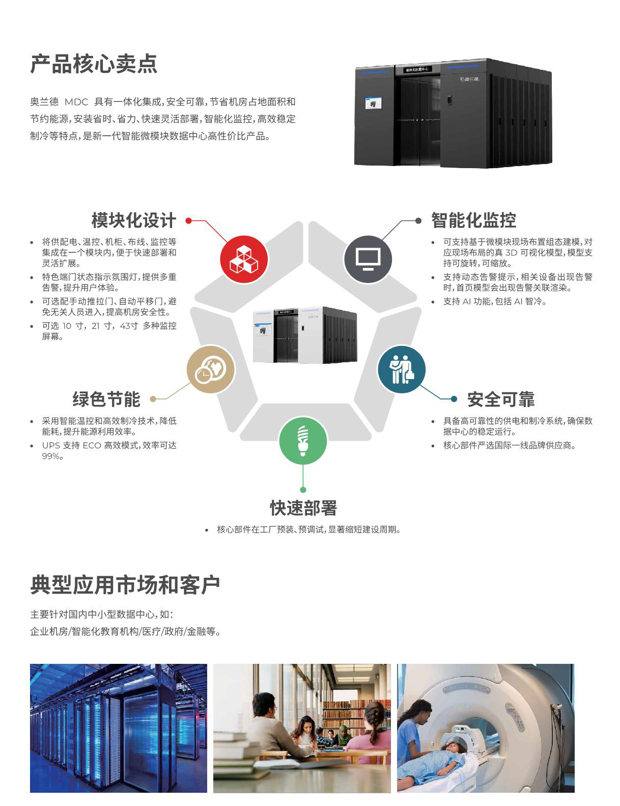 奥兰德MDC是山特公司推出高性价比的新一代智能微模块,主要面向中小型数据中心的需求,致力于为用户提供简单、可靠的数据中心解决方案。