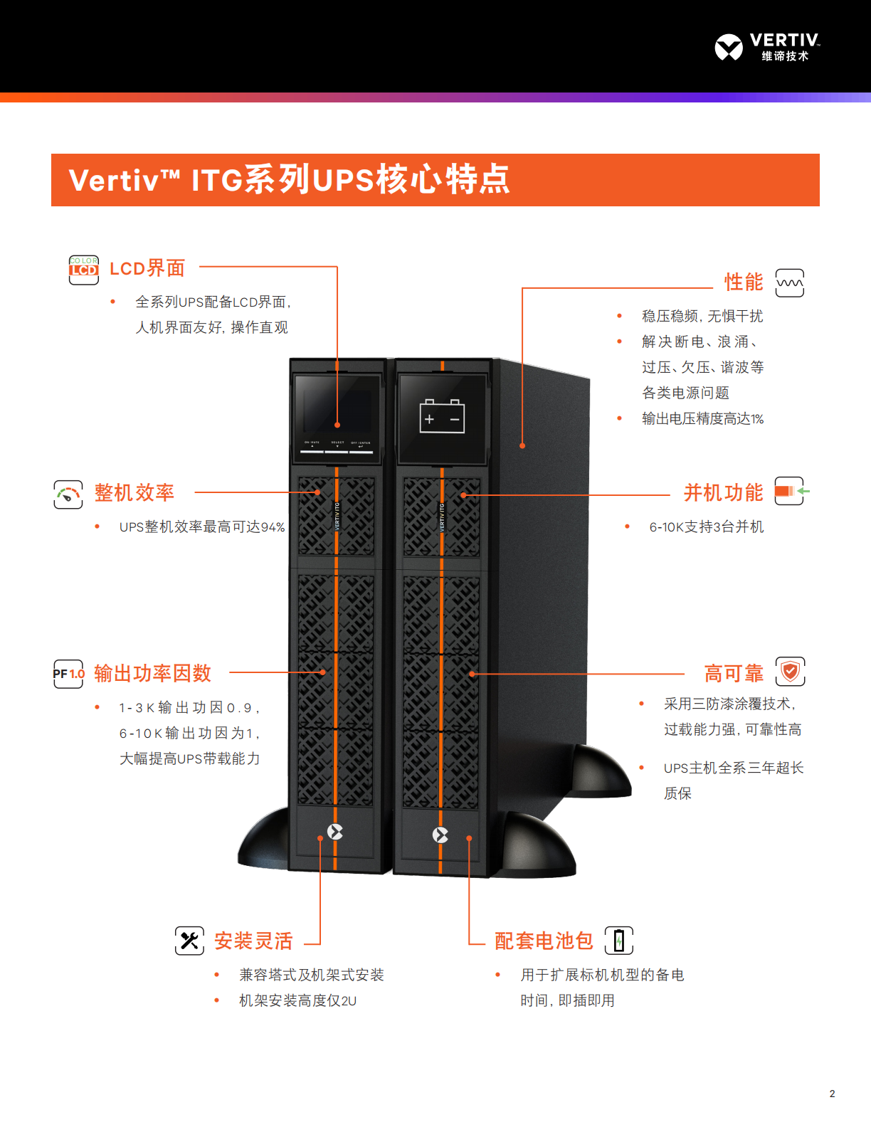 Vertiv™ ITG系列UPS采用双变换纯在线式结构,有效解决市电断电、浪涌、过压、欠压、谐波等各类电源问题。产品容量覆盖1-10KVA,支持塔式和机架式安装,全系列包含标机和长机。产品采用全新外形设计,高可靠UPS拓扑,"颜值"高,性能优异。是各类关键业务场不间断供电保障的理想选择。