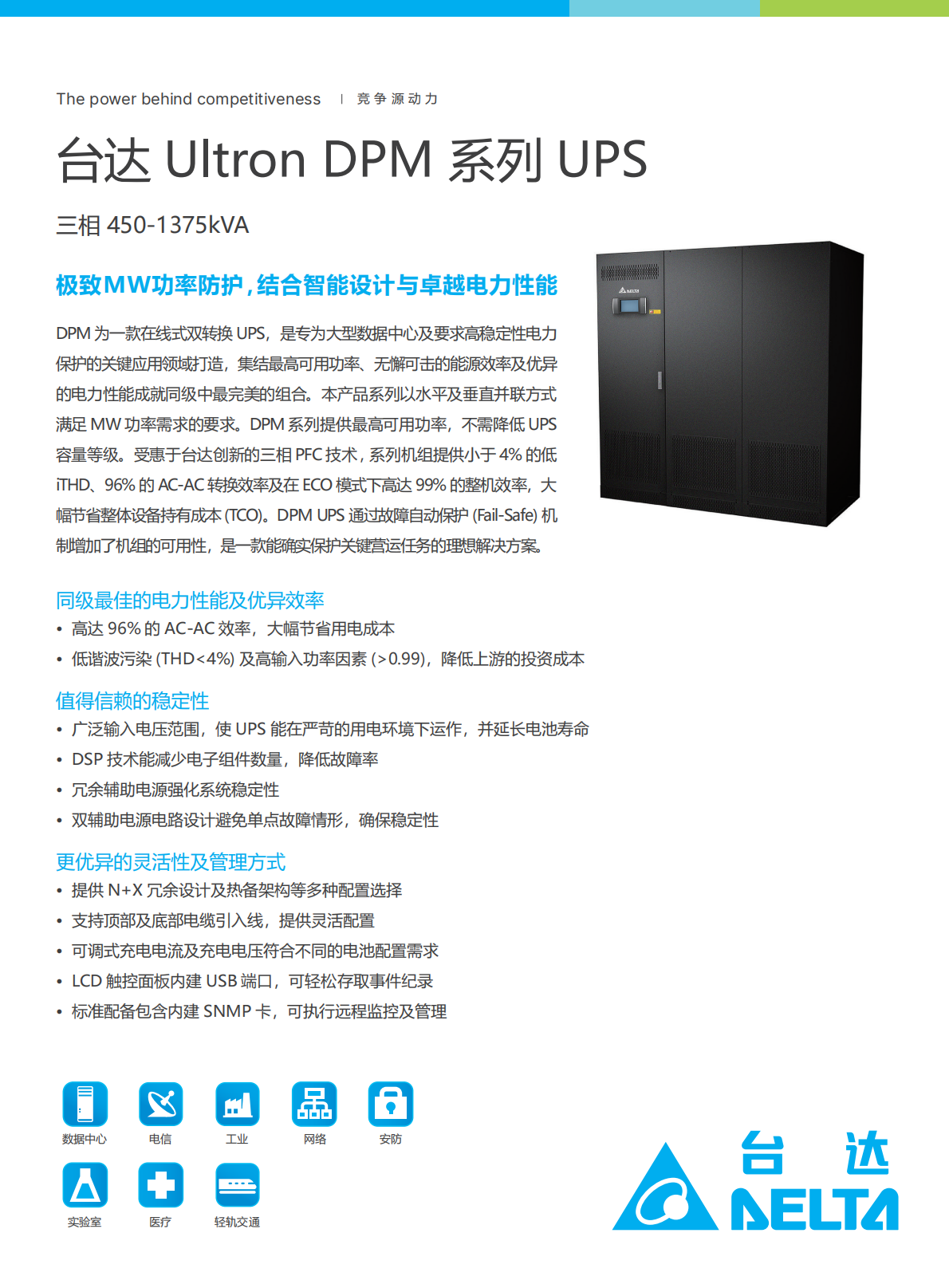 DPM为一款在线式双转换UPS,是专为大型数据中心及要求高稳定性电力保护的关键应用领域打造,集结更高可用功率、无懈可击的能源效率及优异的电力性能成就同级中最完美的组合。本产品系列以水平及垂直并联方式满足MW功率需求的要求。DPM系列提供更高可用功率,不需降低UPS容量等级。受惠于台达创新的三相PFC技术, 系列机组提供小于4%的低iTHD、96%的AC-AC转换效率及在ECO模式下高达99%的整机效率,大幅节省整体设备持有成本(TCO)。DPM UPS通过故障自动保护(Fail-Safe)机制增加了机组的可用性,是一款能确实保护关键营运任务的理想解决方案。