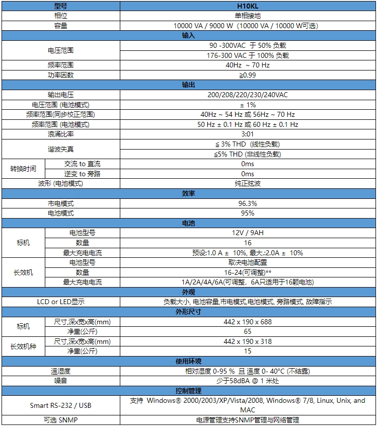 *当1-3KVA UPS设为恒压恒频模式时,输出功率会降额80%,当UPS的输出电压设为208VAC时,输出功率会降额80%。