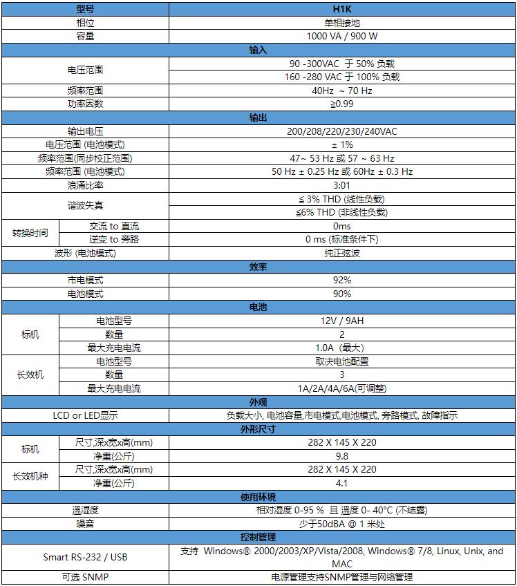 *当1-3KVA UPS设为恒压恒频模式时,输出功率会降额80%,当UPS的输出电压设为208VAC时,输出功率会降额80%。