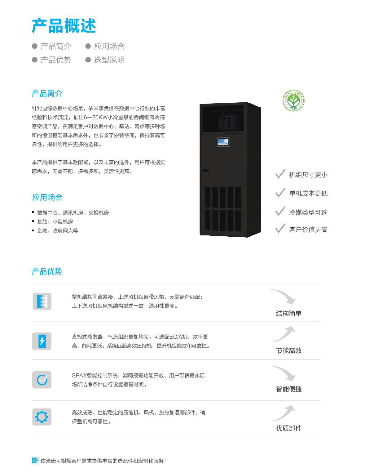 针对边缘数据中心场景,依米康凭借在数据中心行业的丰富经验和技术沉淀,推出6- -20KW小冷 量段的房间级风冷精密空调产品,在满足客户对数据中心、基站、网点等多种场所的恒温恒湿基本需求外,也节省了安装空间,保持着高可靠性,提供给用户更多的选择。