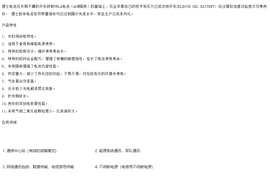 理士电池在长期不懈的开发研制VRLA电池(AGM隔板)的基础上,完全依靠自己的技术和实力已成功地开发出LEOCH GEL BATTERY,经过模拟加速试验显示效果良好, 理士胶体电池各项质量指标均已达到国外先进水平,而且生产已成系列化。
