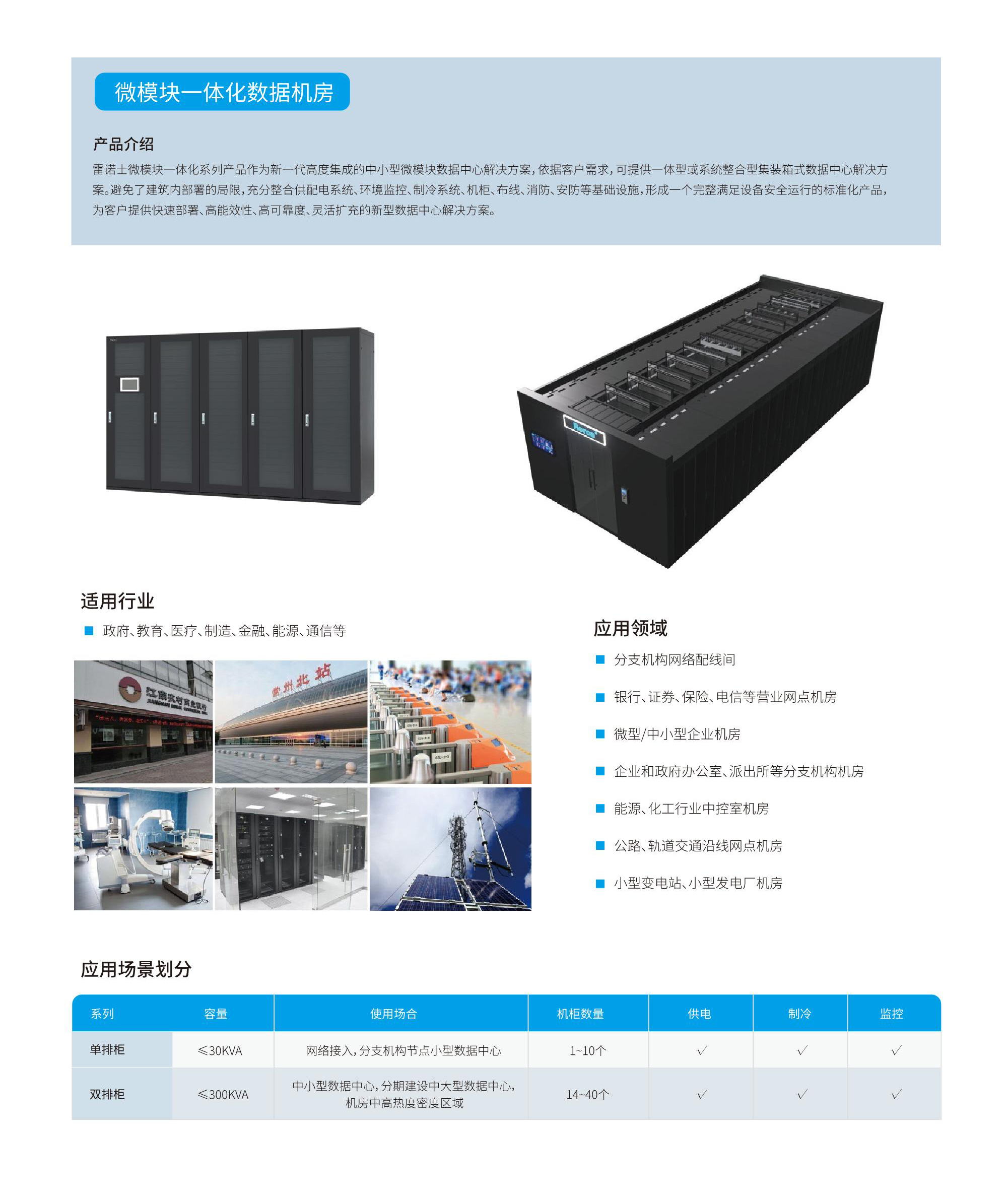 雷诺士微模块一体化系列产品作为新一代高度集成的中小型微模块数据中心解决方案,依据客户需求,可提供一体型或系统整合型集装箱式数据中心解决方案。避免了建筑内部署的局限,充分整合供配电系统、环境监控、制冷系统、机柜、布线、消防、安防等基础设施,形成一个完整满足设备安全运行的标准化产品,为客户提供快速部署、高能效性、高可靠度、灵活扩充的新型数据中心解决方案。